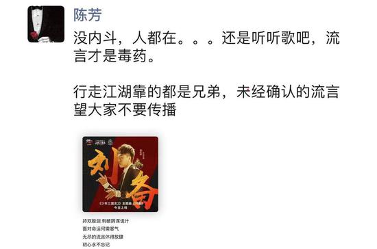 陈芳23日也在朋友圈发言称:“没内斗,人都在”。