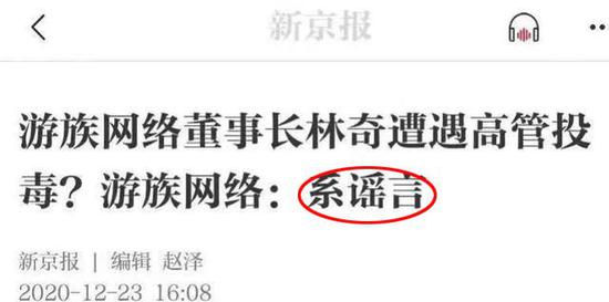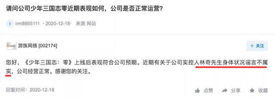 12月18日,有投资者在深交所投资者关系互动平台上询问,游族公司是否正常运营,游族的答复是“近期有关公司实控人林奇先生身体状况谣言不属实。”