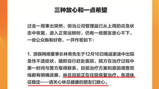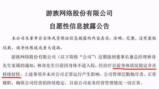 然而同日17:46游族的一则信息披露公告,却直接打了公关团队和高管的脸,该公告称,收到林奇的家属通知,林奇日前因身体不适入院,经治疗后目前状况稳定并持续好转,公司运转一切正常。