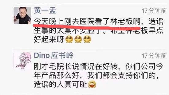 黄一孟留言道:“今天(指23日)晚上刚去医院看了林老板啊”,应书岭也称“刚才毛院长(指复旦大学附属华山医院院长毛颖)说情况在好转”。