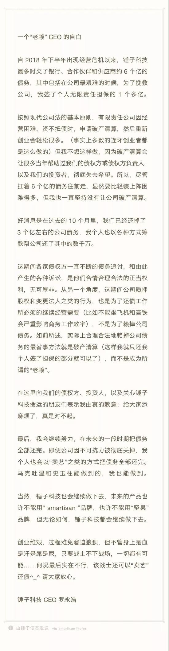 罗永浩对外表示,自从2018年下半年出现经营危机以来,锤子科技破产最多欠债约为6个亿,自己也签了个人无责任担保的1个多亿,过去10个月累计偿还公司债务3个亿左右,个人也还了数千万。罗永浩称,过去10个月里已经偿还了锤子科技6亿欠款中的3亿。