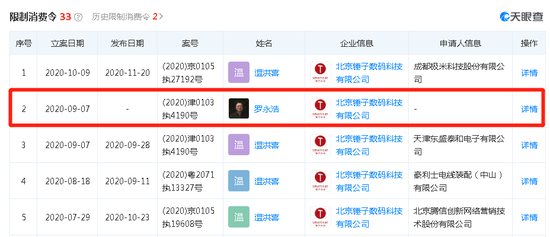 据天眼查显示,2020年12月8日,北京锤子数码科技有限公司新增一则限制消费令,被执行人为罗永浩,执行标的为1590.11万元。