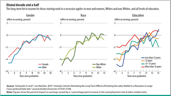 这个悲观结论来自于一项研究,研究对象是在经济衰退时期进入就业市场的新求职者。在加拿大、德国、英国、奥地利、西班牙、比利时、挪威和日本,越来越多的研究发现了类似的结果。