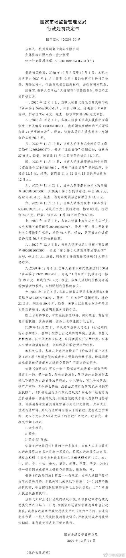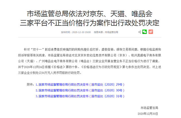 针对“双十一”前后消费者反映强烈的网购先提价后打折、虚假促销、诱导交易等问题,根据价格监测和投诉举报等有关线索,市场监管总局依法对北京京东世纪信息技术有限公司(京东)、杭州昊超电子商务有限公司(天猫)、广州唯品会电子商务有限公司(唯品会)三家企业开展自营业务不正当价格行为进行了调查,并于2020年12月24日依据《价格法》第四十条、《价格违法行为行政处罚规定》第七条作出处罚决定,对上述三家企业分别处以50万元人民币罚款的行政处罚。