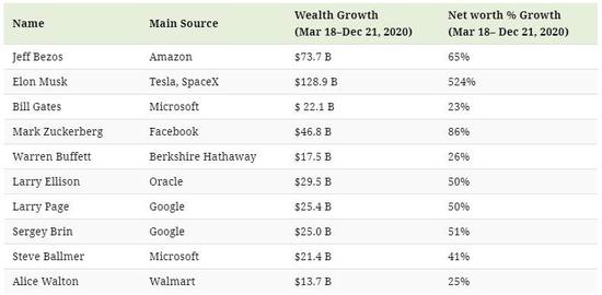 其中,特斯拉CEO埃隆-马斯克(Elon Musk)在新冠疫情实现了最高的净资产增幅,净资产增加了1290亿美元,增幅高达523%。特斯拉的市值在整个2020年都在飞涨,马斯克旗下太空探索公司SpaceX在私人航天业取得了巨大的进步之后长期估值则翻了一番。