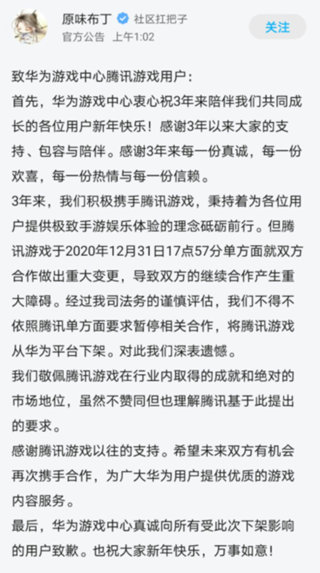 “腾讯游戏于2020年12月31日17点57分单方面就双方合作做出了重大变更,导致双方的继续合作产生重大障碍。经过我司法务的谨慎评估,我们不得不依照腾讯单方面要求暂停相关合作,将腾讯游戏从华为平台下架。对此我们深感遗憾。”