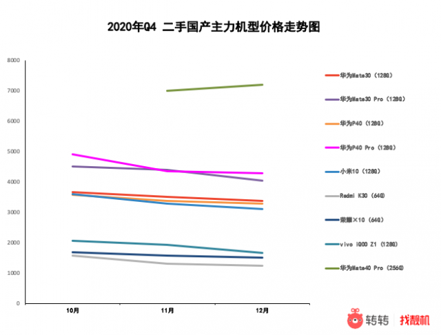 总体来看,国产主力机型中除了华为Mate40 Pro 5G的价格上涨,其他多呈现下滑趋势。其中256G版本的99新转转严选华为Mate40 5G 在12月底的售价比11月上涨200元左右,保值率更是突破100%。