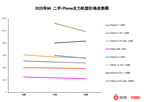 同时,Q4转转集团手机行情显示,二手市场iPhone主力机型均出现较为明显的降价趋势,其中就包括iPhone12。以99新256G版本iPhone 12 Pro Max为例,该机型下跌幅度最大,相比11月下跌了12.1%;但是受供货紧张影响,iPhone12 Pro的价格维持涨势。Q4转转集团手机行情显示,2020年12月底,128G版本的99新iPhone12 Pro价格在8300元左右,相比11月上涨了4.1%左右。