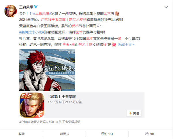 2021年伊始,《王者荣耀》官方宣布,广佛线王者荣耀主题武术专列出发!据了解,该地铁由佛山市文广旅体局携手《王者荣耀》共同打造,采用全手绘设计,全面展示了《王者荣耀》中李小龙、游戏角色“裴擒虎”为主题的武术主题皮肤元素。