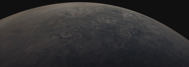 6月2日,朱诺号第27次近距离飞越木星时,拍摄到这颗气体巨行星的旋转云。天文学爱好者凯文·吉尔随后将数据转换成视频,其中包含朱诺号近距离经过时拍摄的41张静止图像,这些图像通过数字方式投射在一个球体上,使用一个虚拟“相机”从不同角度提供木星的视图。