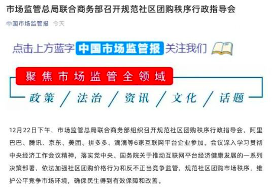 2020年12月22日,市场监管总局联合商务部召开规范社区团购秩序行政指导会,参会企业有阿里、腾讯、京东等。会上为严格规范社区团购经营行为,要求互联网平台严格遵守“九不得”。其中,就包括不得低价倾销、实施没有正当理由的掠夺性定价、排除限制竞争以及利用数据优势“杀熟”等。