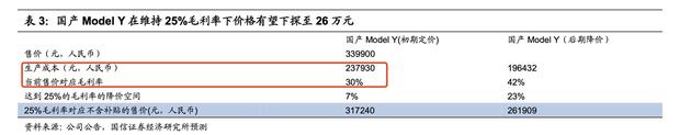 国信证券认为,随着零部件国产化率提升,国产Model Y生产成本将下降至19.64万元,具备进一步降价空间。此外,考虑到各国对电动车型在购车补贴、牌照限制、税收等综合优惠政策,Model Y在全球各国均具备较强的竞争力,未来毛利率存在下调空间,假设毛利率维持在25%以上,价格有望下探至26万元左右(补贴前售价)。
