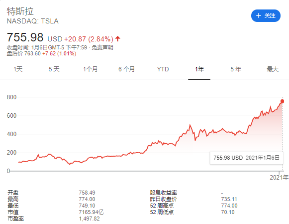 短短三天时间,加拿大皇家银行对特斯拉的目标价就从339美元一下子上调到了700美元,翻了一倍还多。特斯拉周三报收755.98美元,和去年3月时的低点相比,已经涨了近10倍。1月4日,新年的第一个工作日,加拿大皇家银行分析师Joseph Spak给出了特斯拉339美元的目标价,和当时特斯拉的价格相比,直接腰斩。