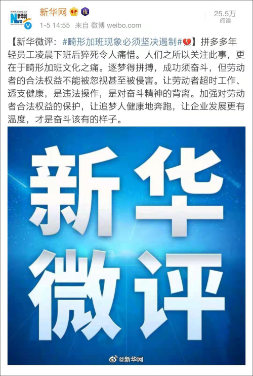 在前两天的“拼多多22岁女员工加班猝死”的一事中,新华社就曾发布评论称,畸形加班现象必须坚决遏制。