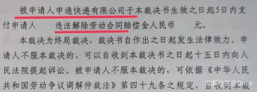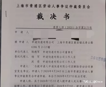 小江最终向上海市青浦区仲裁委员会提交了劳动仲裁申请,仲裁委裁定申通快递构成违法解除劳动合同行为,判决其依法支付赔偿金。