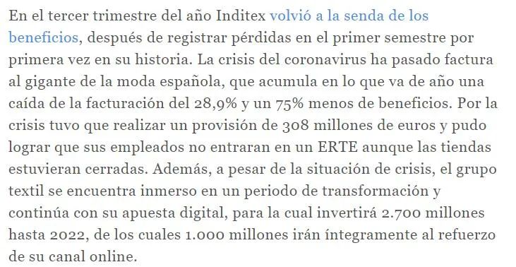 2020年是被疫情阴霾笼罩的一年,疫情导致实体店经济下滑,Inditex在2020年第三季度出现了历史上第一次亏损,营业额下降28.9%,利润下降75%。