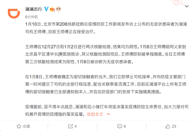 在1月8日,王师傅被确定为密切接触者的当天,我们立即停止司机接单,并向防疫主管部门第一时间提交了司机的全部行程信息,配合关联乘客流调工作,目前在滴滴平台上所有王师傅的密切接触者已全部通知到本人,并且在防疫部门的安排下实施隔离措施。