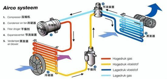 空调压缩机通过改变冷媒的压强,让冷媒在室外蒸发,吸收热量,运送到室内后,再次改变它的压强使它冷凝,热量便到手了。