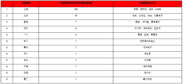 “胡润世界500强”上的非中国企业中,有266家公司,即59%,在13个中国城市设有地区总部,其中绝大多数位于上海(160家)和北京(79家),还有一些位于香港、深圳和广州。胡润表示:“还有40%多的非中国企业没有在中国设立地区总部,还有未被挖掘的机会。上海作为国际化大都市,是非中国企业在中国设立地区总部的首选城市,其次是北京。”