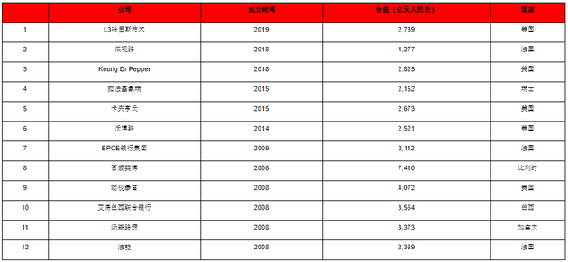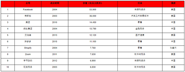 61家公司成立于2000年代,其中最年轻的是三家中国公司:拼多多仅用了五年达到1.1万亿元的价值,其次是六岁多的电动汽车蔚来和小鹏。2000年代成立的价值最大的十家公司中,4家来自中国,它们是美团、蚂蚁集团、拼多多和字节跳动。