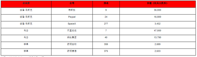只有3位企业家创立了不止一家“胡润世界500强”企业:埃隆·马斯克(特斯拉、Paypal和SpaceX)、马云(阿里巴巴和蚂蚁集团)和李革(药明生物和药明康德)。
