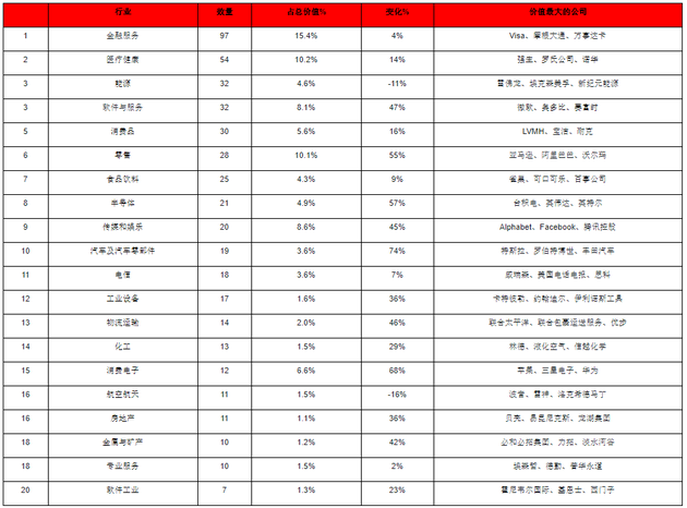 金融服务业以97家公司领跑,其中以价值3万亿元的支付平台Visa为首;其次是医疗健康,有54家,以价值2.6万亿元的强生为首;接下来是能源、软件与服务、消费品、零售和食品饮料行业。
