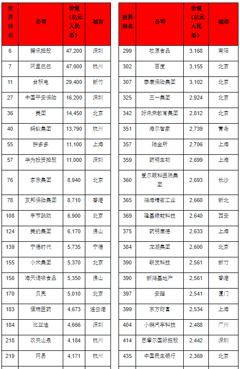 中国是世界涨幅最快的国家,51家上榜企业总价值比去年增长73%,达到35万亿元,几乎是排在其后的日本、法国和英国三个国家的总和。排名第一的是腾讯,价值4.7万亿元,阿里巴巴紧随其后,这是榜单前十中仅有的两家非美国公司,也是第一次有两家中国企业进入全球十强,五年前和十年前的前十名中一家中国企业都没有。