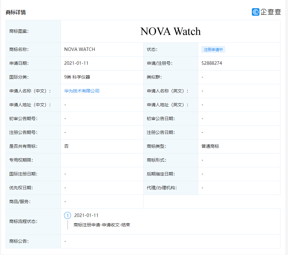 1月18日消息,今日,根据企查查网站了解到,华为技术有限公司目前已申请“NOVA Watch”商标,申请时间为2021年1月11日。商标国际分类为9类科学仪器,状态为注册申请中。此次,华为申请注册该商标或意味着旗下nova系列将增加手表新品。