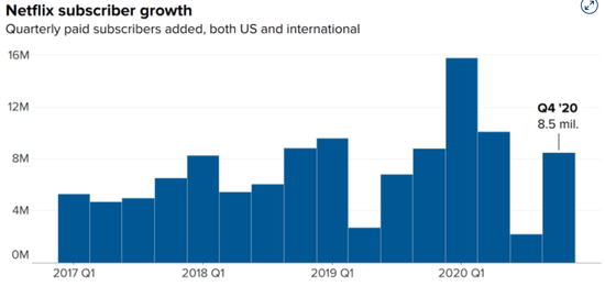 Netflix表示,四季度流媒体付费订阅用户净增851万,市场预期增加606万;四季度付费订阅用户为2.037亿,市场预期2.012亿。
