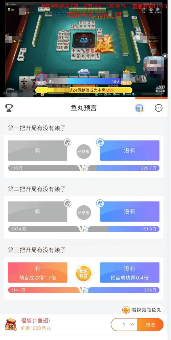 朱先生称,自己第一次是通过斗鱼平台买的鱼丸,“买了几百块钱的”。最早参与的预言竞猜,包括热门游戏和麻将游戏的竞猜,游戏开局前,主播会设定预言内容,邀请访客参与预言竞猜。“游戏中主播最终赢还是输、是不是mvp(最优选手)都可以拿来竞猜。”