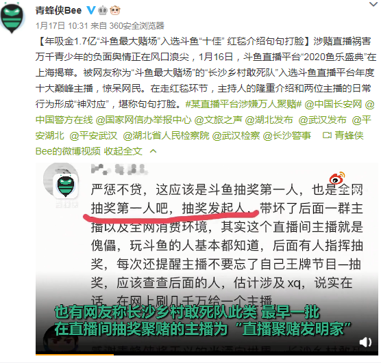 中国青年网短视频官方微博@青蜂侠Bee1月17日发布视频报道称,在16日当晚的“2020鱼乐盛典”上,被网友称为斗鱼最大赌场的“长沙乡村敢死队”入选斗鱼直播平台年度十大巅峰主播。