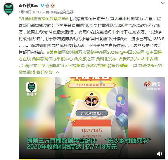 报道称,据第三方直播平台统计,斗鱼平台“长沙乡村敢死队”直播间2020年流水高达1亿7718万元,日流水最高1300万元。因该直播间一般在晚上10点开始涉嫌聚赌的抽奖活动,因此形成公开暗号“十点经济课”。不少青少年沉迷其中,有人半小时内疯狂下注三十万元。而斗鱼平台向青蜂侠表示:这些都是经过监管部门审核的。