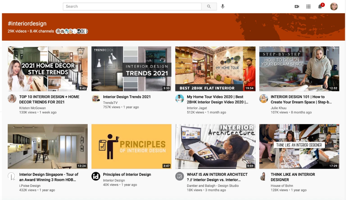 这样一来,搜索结果就跟Facebook或Twitter等社交网络上的标签搜索不一样了。当使用这些标签登陆页面来发现新视频可能有些困难,但对于想要更好地利用标签格式的创作者来说这仍然是一个有趣的研究工具。比如#interiordesign标签是一个拥挤的地方,其有8400个频道和29,000个视频,但一个小众标签如 #interiordesignlivingroom则只有不到100个频道和视频。如果人们开始定期使用标签来寻找视频,那么使用有针对性的标签可能会帮助创作者的视频更容易被找到。