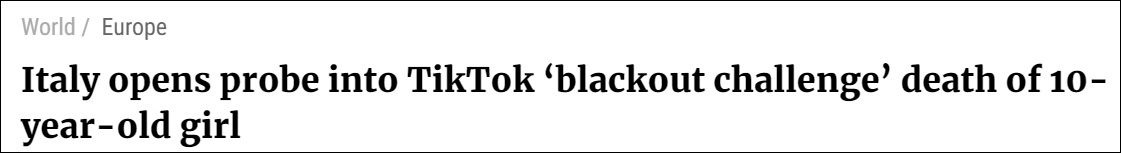 风靡全球的短视频应用TikTok,本周被卷入一起意大利女童死亡案件,随后收到了该国监管部门的屏蔽指令。据法新社1月22日报道,意大利检方已经对一名10岁女孩的意外死亡事件展开调查,后者据称参加了TikTok上的“眩晕挑战”(blackout challenge)。