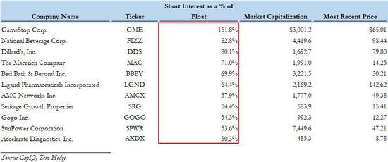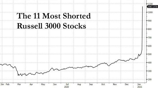 除了GameStop这只“明星股”之外,昨天几乎所有做空的股票都在暴涨,包括11家罗素3000指数中被卖空做多的股票。