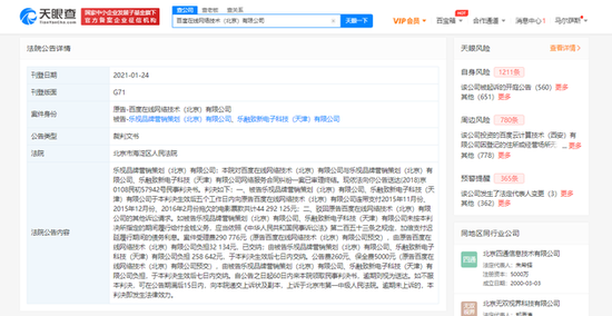 1月26日下午消息,天眼查App显示,1月24日,百度在线网络技术(北京)有限公司,乐融致新电子科技(天津)有限公司与乐视品牌营销策划(北京)有限公司的网络服务合同纠纷案民事一审判决书公布。案号为(2018)京0108民初57942号。