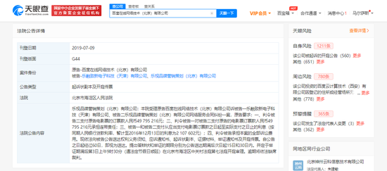 天眼查App显示,据2019年7月9日百度在线网络技术(北京)有限公司与乐融致新电子科技(天津)有限公司,乐视品牌营销策划(北京)有限公司相关案件的起诉状副本及开庭传票显示,百度称,乐视应支付其拖欠的电影票的订票款人民币49795216元,乐融亦对乐视支付该笔钱承担连带责任;同时,暂计至2016年12月13日,乐融及乐视应支付给百度利息2107602元。