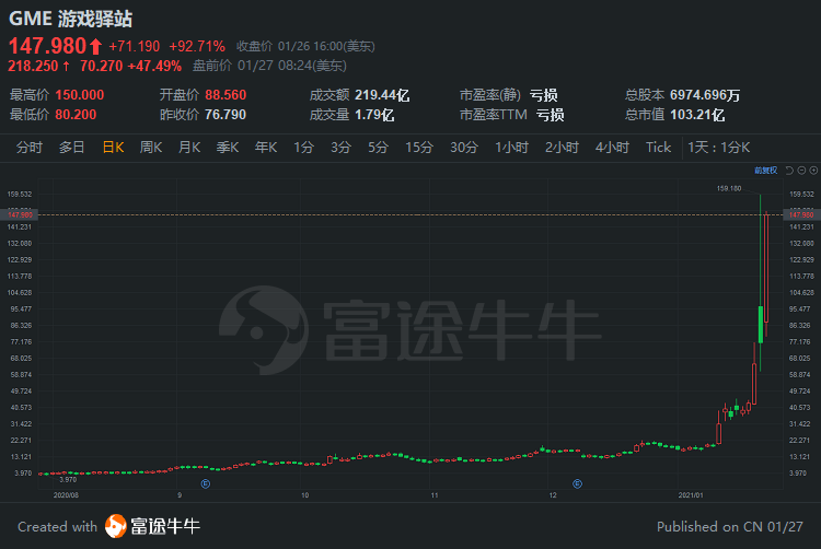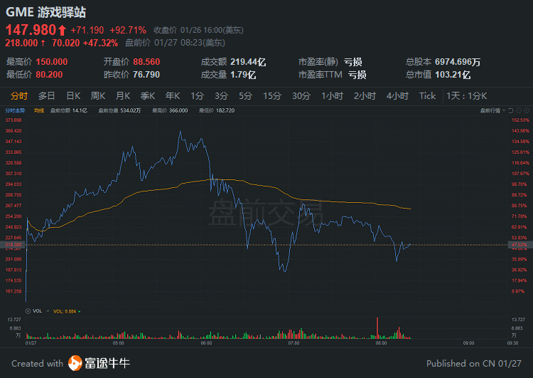 很长一段时间股价表现死气沉沉的美国视频游戏零售商GameStop (GME)最近一个月的涨势可谓‘亮瞎了眼’。在周一多空拉锯战导致股价剧烈波动并令纽交所9次短暂叫停交易后,其涨势在周二丝毫没有放缓,当日股价飙升93%,收于147.98美元。