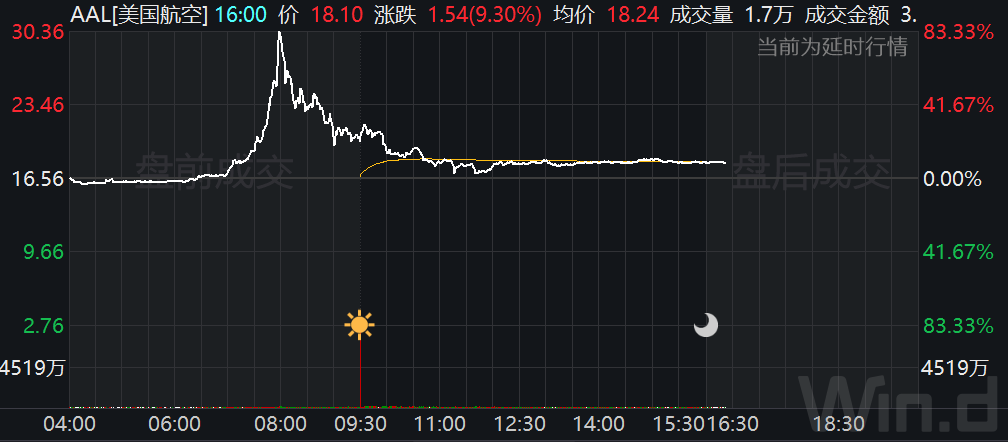 其中,美股航空股集体上涨,波音涨1.66%,美国航空涨9.3%,达美航空涨4.05%,西南航空涨1.16%,联合航空涨4.01%。