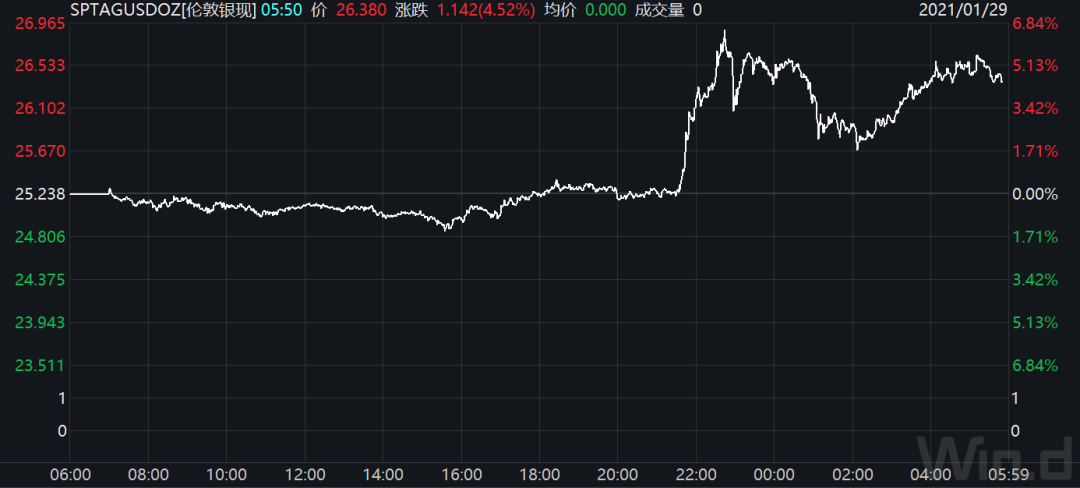 截至北京时间29日5:50,伦敦银现报26.38美元/盎司,涨4.52%,盘中一度创下新高涨近7%。
