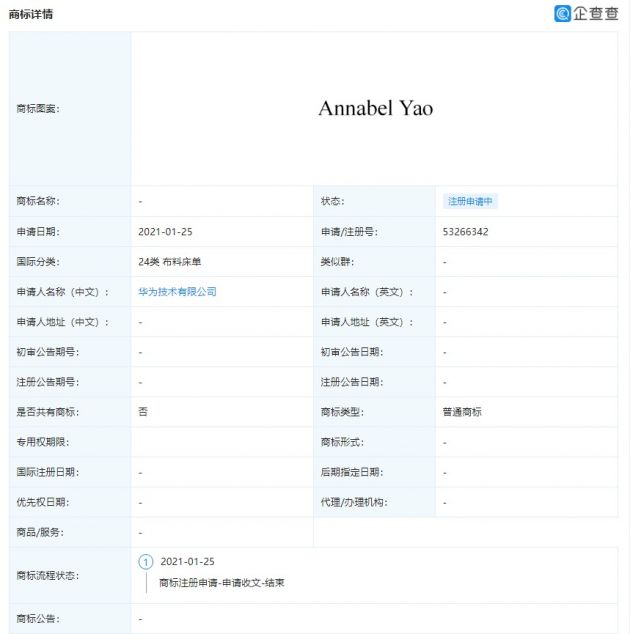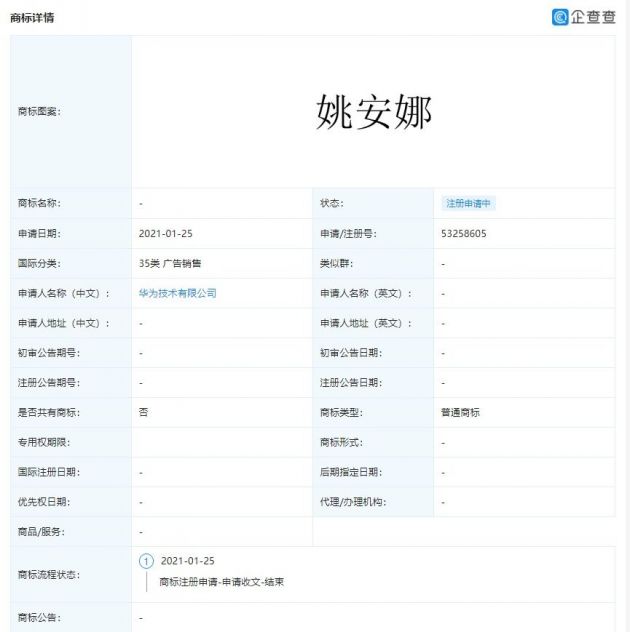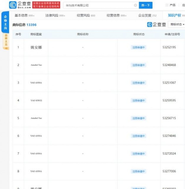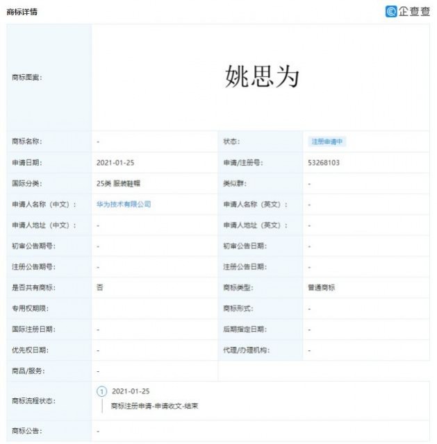 2月2日消息,企查查APP显示,华为技术有限公司于1月25日申请注册“姚思为”、“姚安娜”商标,其中国际分类包含30类 方便食品、14类珠宝钟表、38类 通讯服务等,目前商标状态为注册申请中。