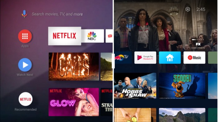 全新的界面使得Android TV的外观跟Google TV更加一致,其在菜单顶部新增了特色内容的滚动旋转并抛弃了超大图标以为更多的极简主义标签让步。