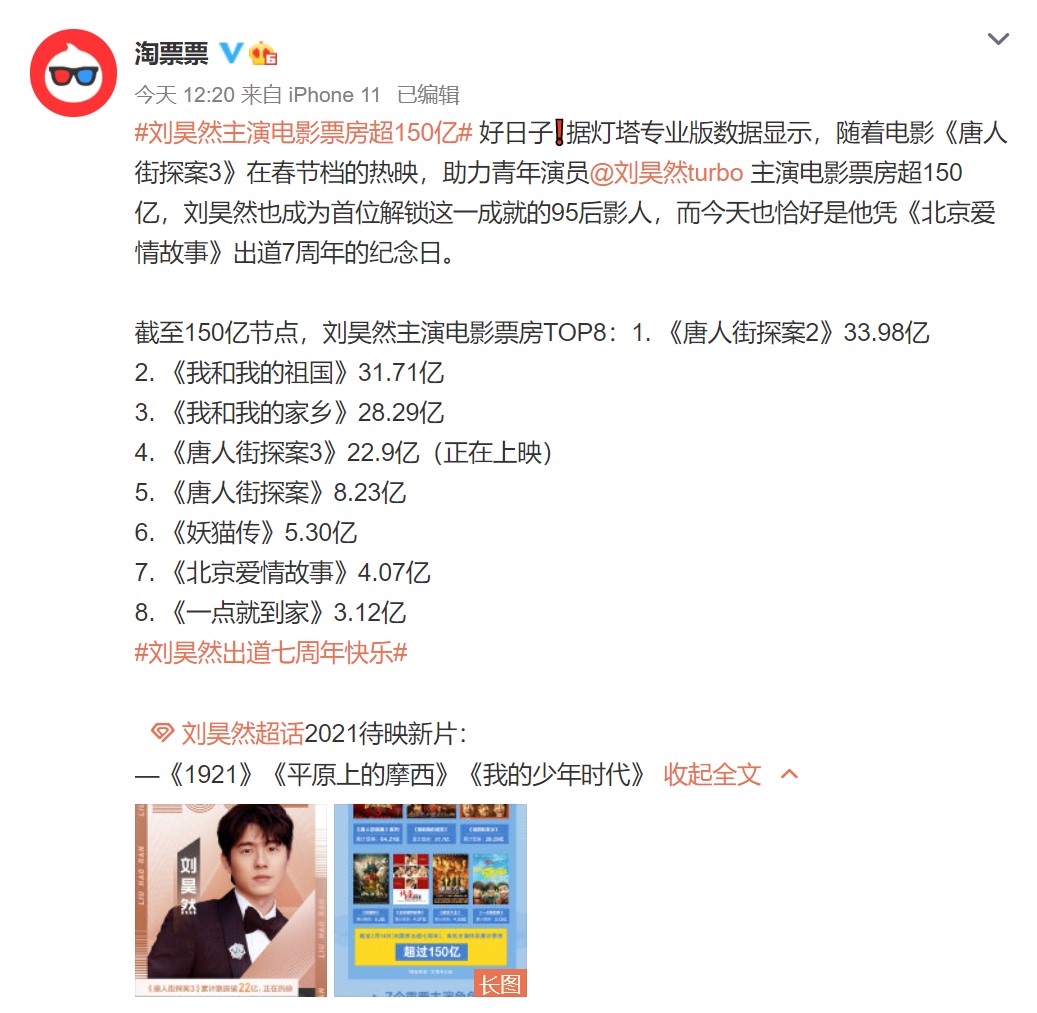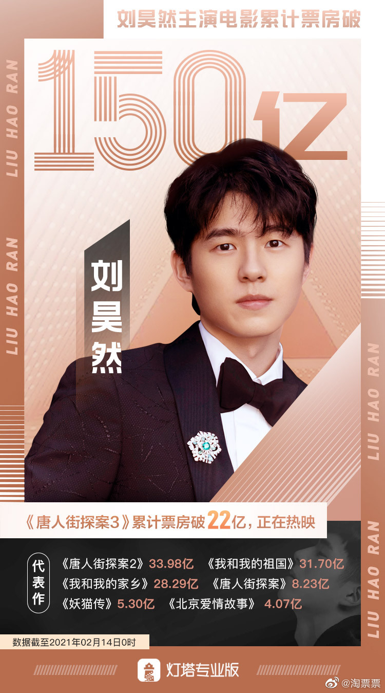 今日(2月14日),据淘票票官方微博公布的消息,刘昊然主演电影票房超150亿,成为继吴京、黄渤、沈腾、王宝强后,第五位票房超150亿男演员。
