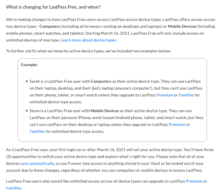 本次调整将从 2021 年 3 月 16 日正式生效。当你在该日期或之后登录 LastPass Free 时,你基本上会选择你想要的版本:你登录的第一个设备将自动成为你的活动设备类型。LastPass Free 最多允许更改 3 次,之后将永久设置。