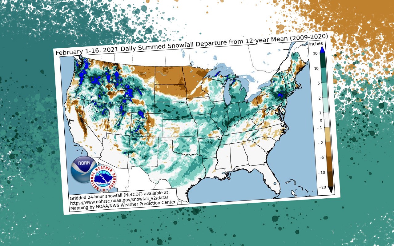 NOAA地图显示的是2月1日-16日期间的数据,每天的降雪量之和与12年平均值的偏差。美国大部分地区现在的降雪量非常平均(就今年这个点而言),或者说比过去12年的平均水平高出相当多。