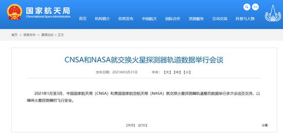 2021年1月至3月,中国国家航天局(CNSA)和美国国家航空航天局(NASA)就交换火星探测器轨道星历数据举行多次会谈及交流,以确保火星探测器的飞行安全。
