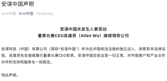 ARM中国在一份声明中表示,吴雄昂的立场"符合合法注册,并得到中国法律法规的确认。"