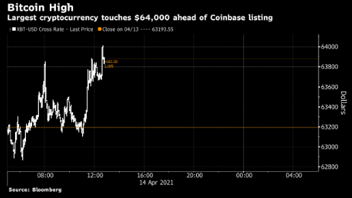 比特币周三继续上涨,首次突破64,000美元的水平,超越一天前创下的纪录高点,在Coinbase Global Inc.本周将上市之前,市场对加密货币看涨。比特币在亚洲盘中一度上涨1.6%,至64207美元。包括Riot Blockchain Inc.和Marathon Digital Holdings Inc.等与加密货币有关的股票在美国交易时间内上涨 。