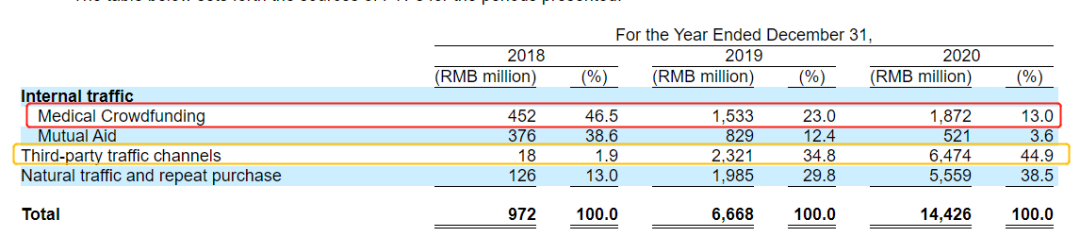 水滴筹自身的流量价值正在缩减,2018年至2020年,其为公司带来的流量占比分别为46.5%、23%、13%。而第三方流量渠道的占比逐渐增加,三年占比变化分别为1.9%、34.8%、44.9%。