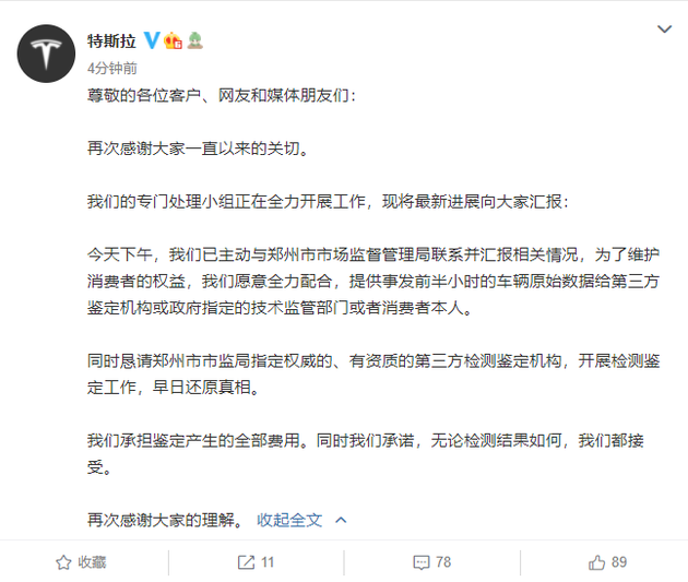同时,特斯拉表示恳请郑州市市监局指定权威的、有资质的第三方检测鉴定机构,开展检测鉴定工作,早日还原真相。特斯拉方承担鉴定产生的全部费用。同时其承诺,无论检测结果如何,我们都接受。